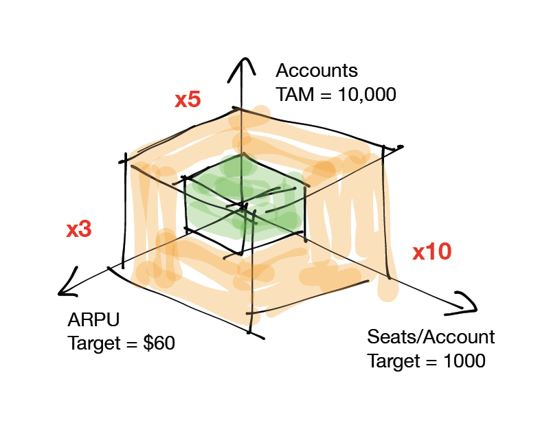 Increasing the number of accounts is obvious: double the accounts, double the revenue, but if initially the average number of seats per account is 100 and the total potential by penetrating the entire account is an average of 1000 seats, that is a 10x growth potential in revenue. Likewise if the initial monthly revenue per user is $20 but there is an opportunity to up sell these to $60, that is another 3x upside. This also helps set a pretty clear direction on where marketing and sales resources should be invested in order to maximize the multiplicative effect of 3D growth. In the above example if your company has 2000 accounts with an average of 100 seats paying $20/month, you have a monthly run rate of $4M. If you did nothing but increase to your full ARPU potential and account penetration you would have a 30x growth in your business or $120M/month. Go from 2000 to 10,000 and you have another 5x for a total of 150x. I know this is a bit of an exaggeration since 100% of TAM is not reality, but it helps make the point of the leverage that comes from being able to think about the business growth in three dimensions.